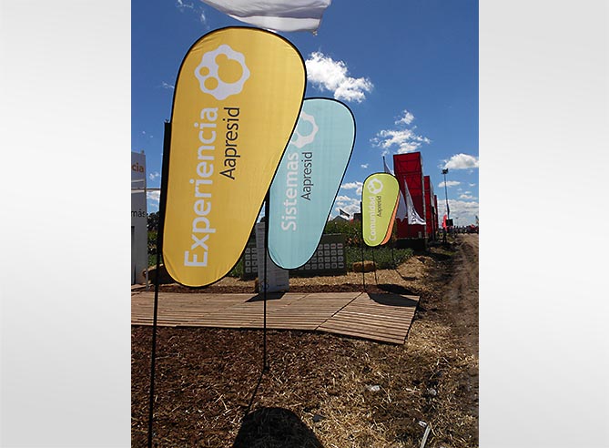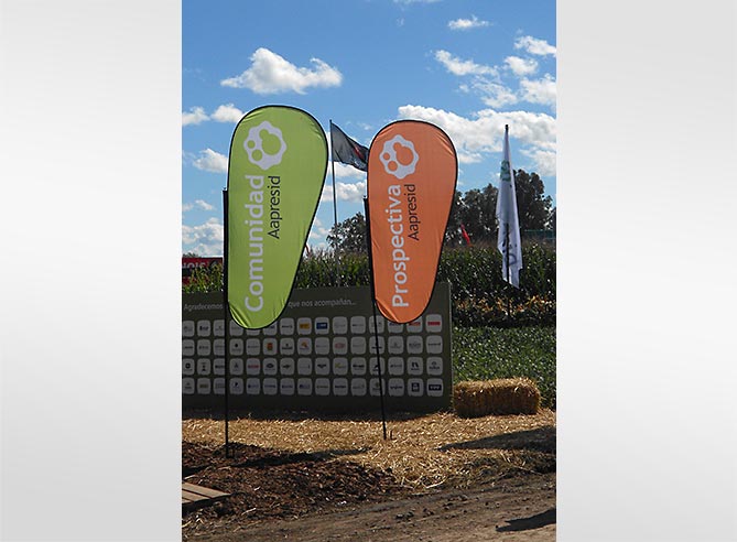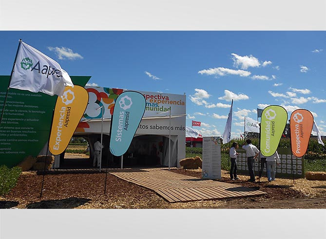 Para esta megamuestra AAPRESID eligió utilizar los Skybanners Plegables de Armadillos para enmarcar el stand y subrayar sus principales atributos: Prospectiva, Experiencia, Sistemas y Comunidad.